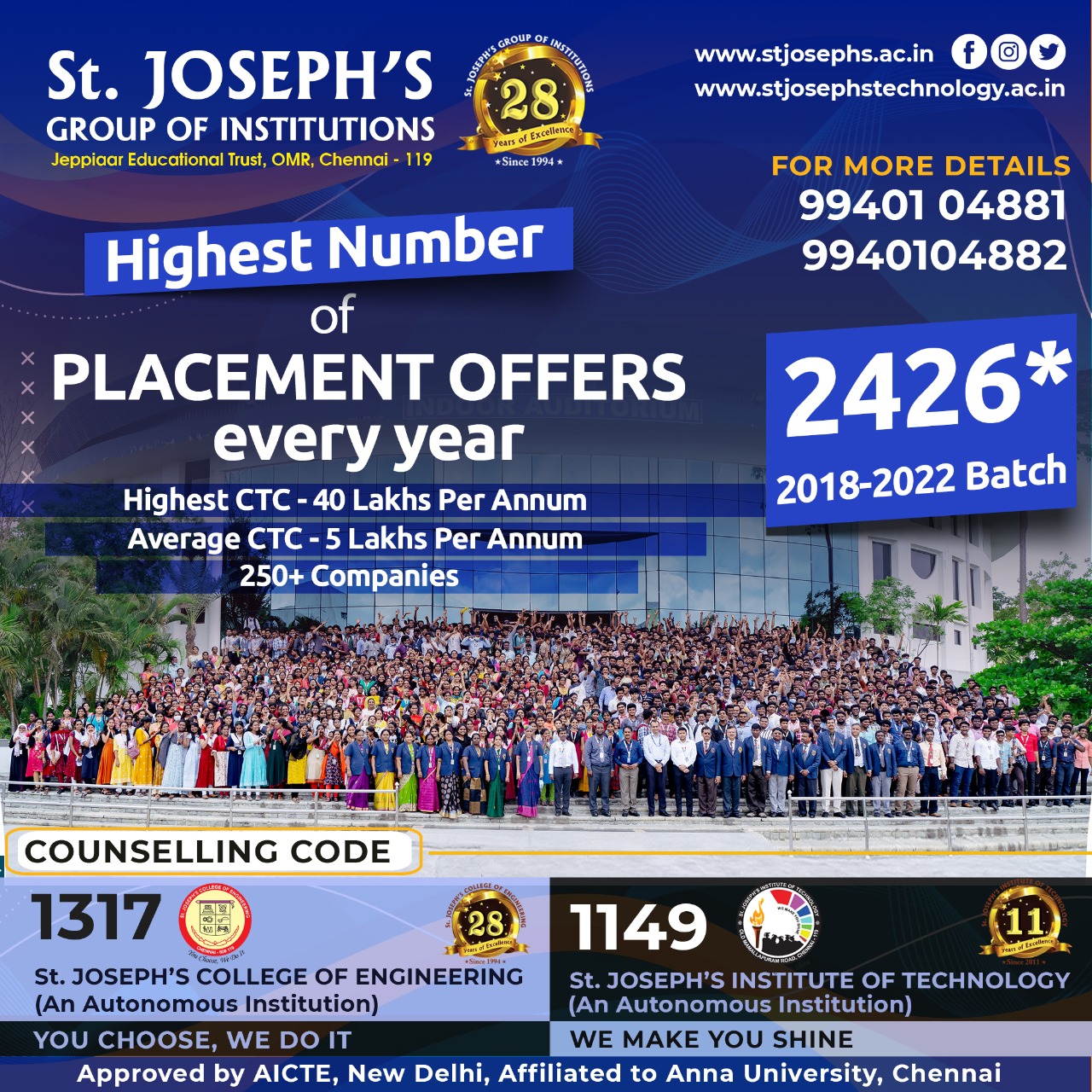 St. Joseph’s College of Engineering established in the year 1994, celebrating the Silver Jubilee in this year, ranks among the top Engineering Colleges in Tamil Nadu and is affiliated with Anna University, Chennai. The college has been accredited by the National Board of Accreditation, New Delhi. Also accredited by NAAC "A+". Every year a large number of students from our college win accolades at the National and International level for their projects, cultural and sports achievements besides securing many University Ranks. Many of our students get placements in top-notch organizations besides securing admissions in world-class Universities in India and abroad.